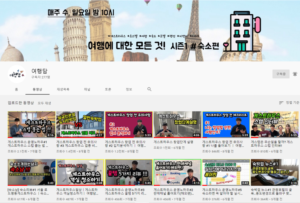 숙소 운영의 매너리즘에 벗어나고자 시도했던 여러 가지 활동들은 다시 숙소에 대한 애정을 되찾을 수 있는 계기가 되었다. 내가 첫 번째로 시도한 것은 ‘숙소 운영에 대한 콘텐츠를 다루는 유튜브 채널 개설’이었다. 숙소 운영 관련 정보들은 사실 온라인에서 몇 번의 검색과 클릭만으로도 쉽게 찾아볼 수 있지만 영상 콘텐츠는 많지 않았다. 특히 숙소를 이용한 고객들의 후기는 쉽게 검색할 수 있는 반면 운영자의 입장에서 운영 정보를 공유하는 콘텐츠는 정말 찾아보기 힘들었다.